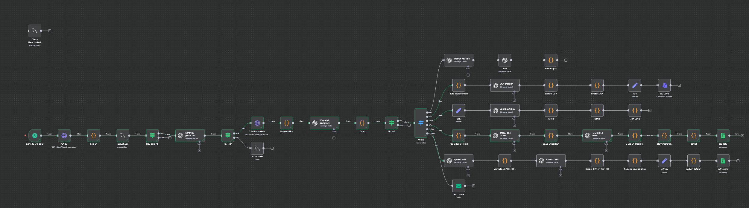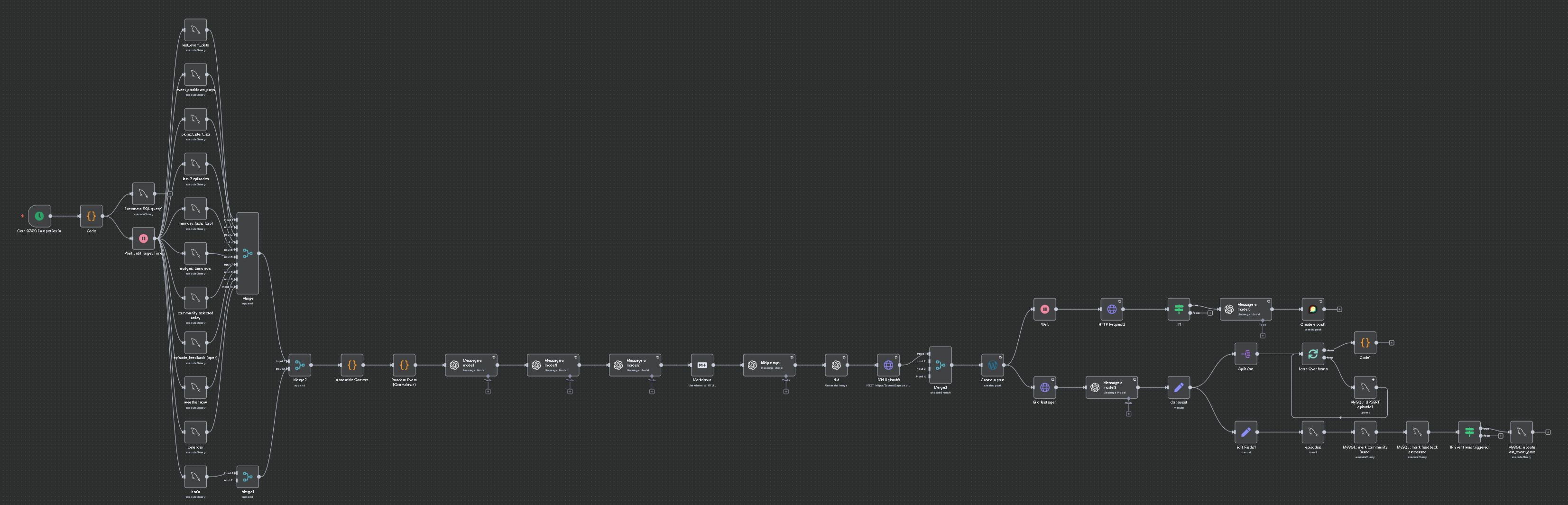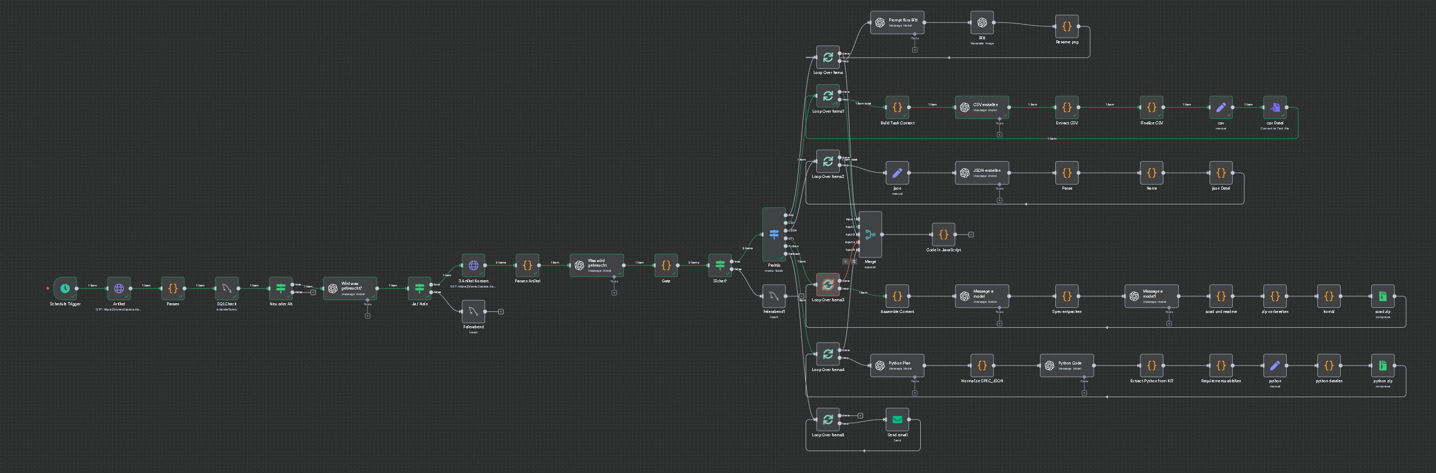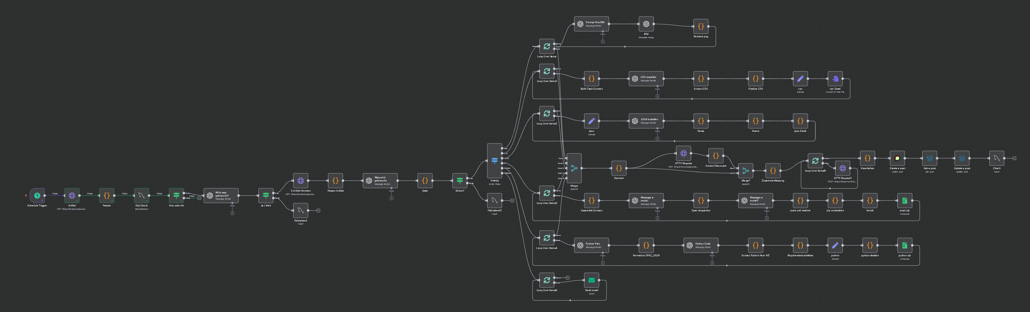 Zum Start gibts ein kleines WordPress Plugin, geschrieben mit Hilfe von ChatGPT. Das Forum hier ist mit Discourse erstellt. Es hat bereits eine Integration bei n8n, womit die ganzen Workflows erstellt werden. Zudem gibt es ein Discourse WordPress Plugin. Veröffentlichter Artikel wird direkt als Thread hier im Forum gepostet.